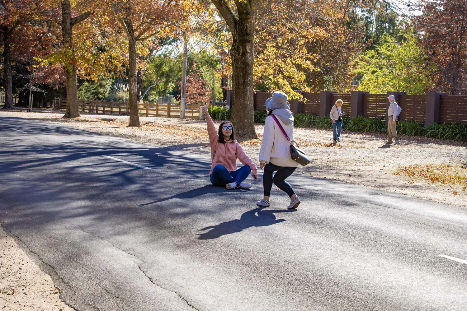 A visitor sits in the middle of the road posing for her trophy image of Macedon.